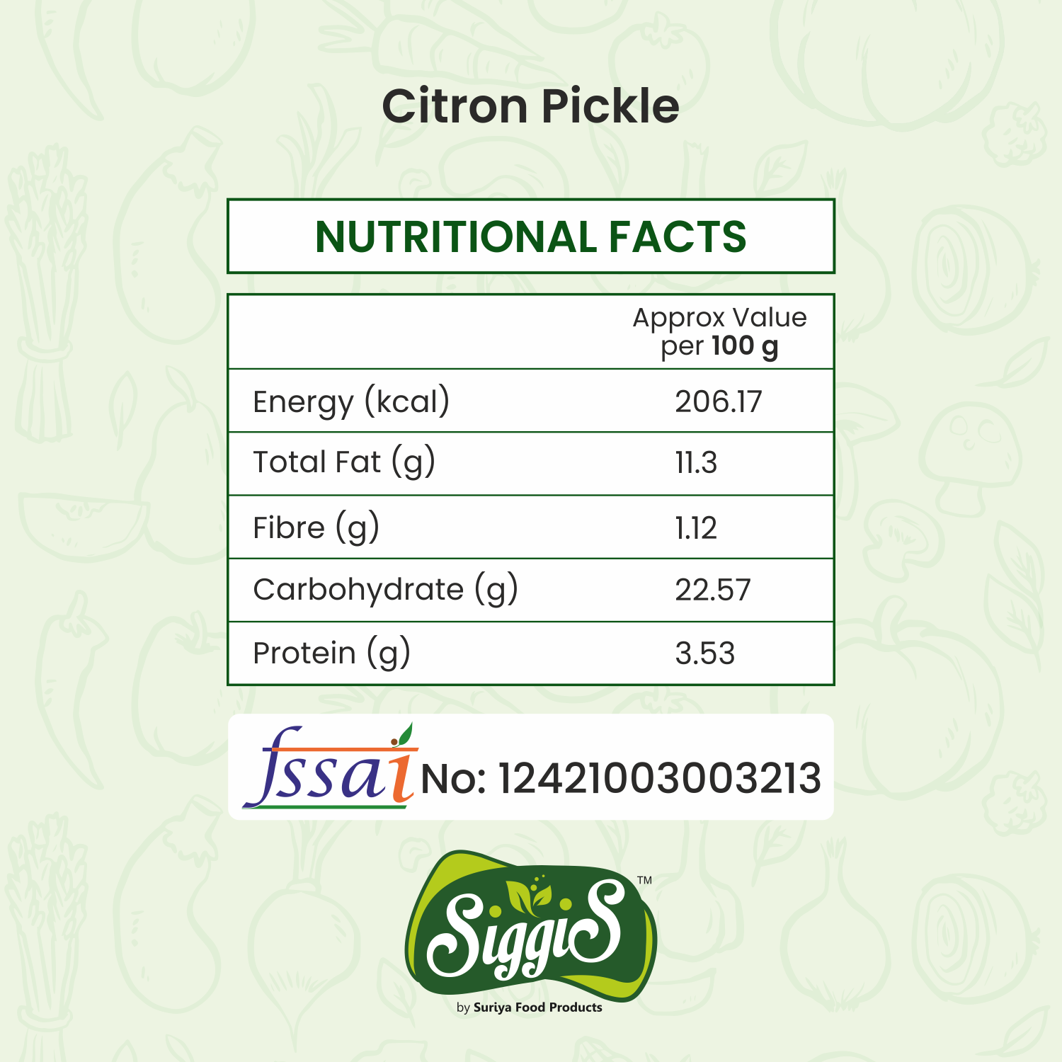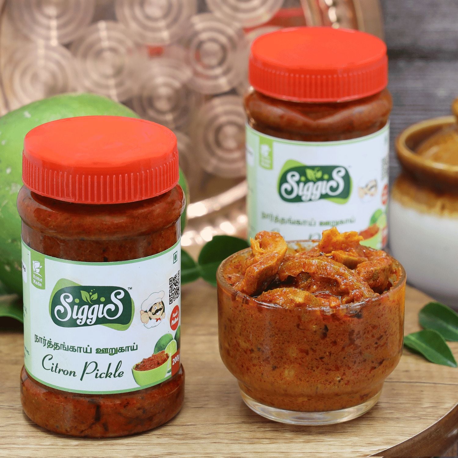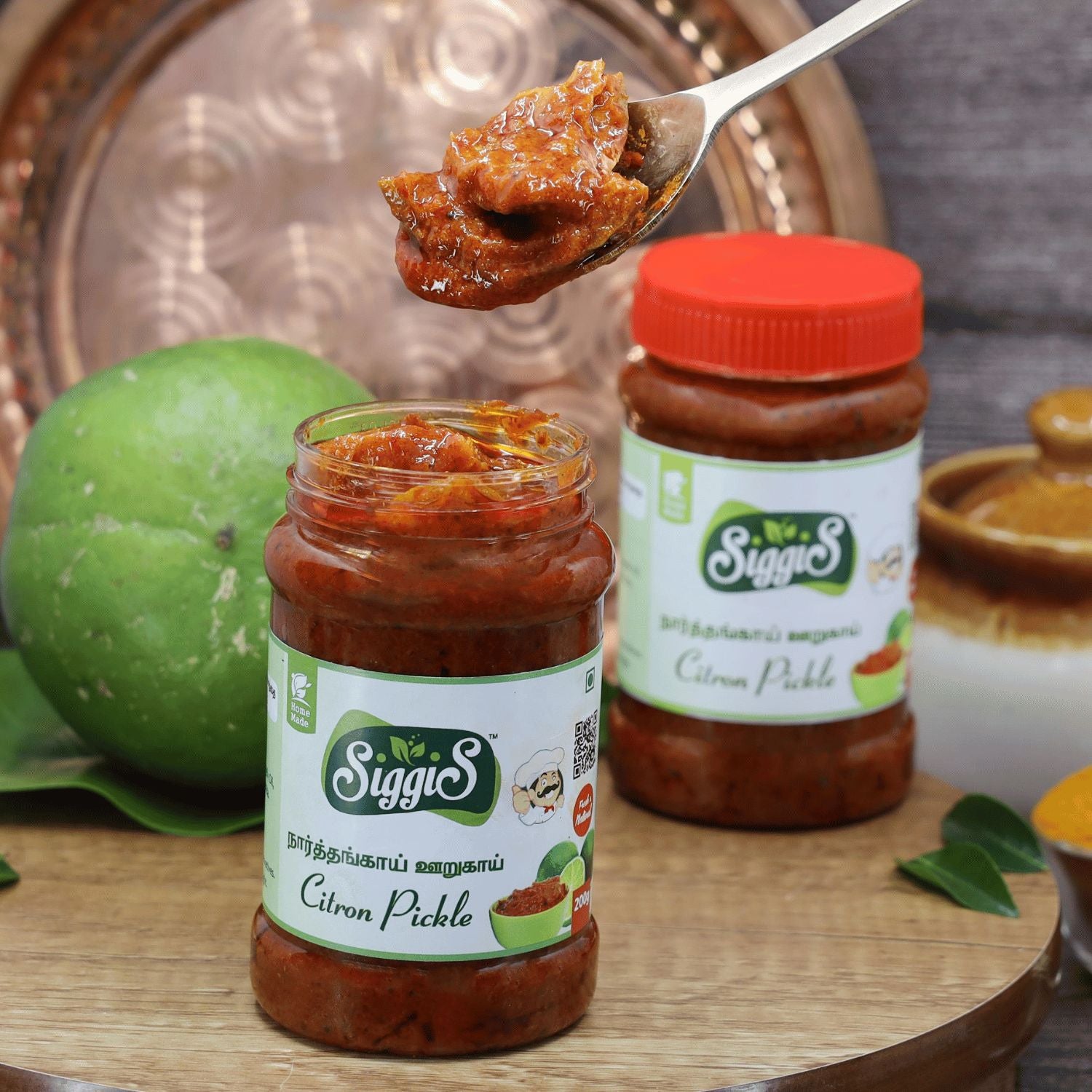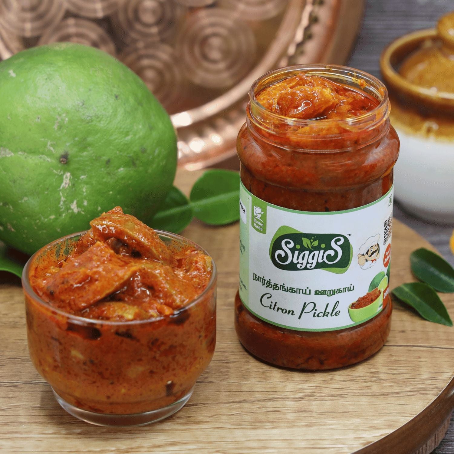 SiggiS Citron or Narthangai Pickle is a tasty pickle that is frequently used as a condiment with meals, providing a particular flavour to rice, or as a side dish with a variety of other cuisines.